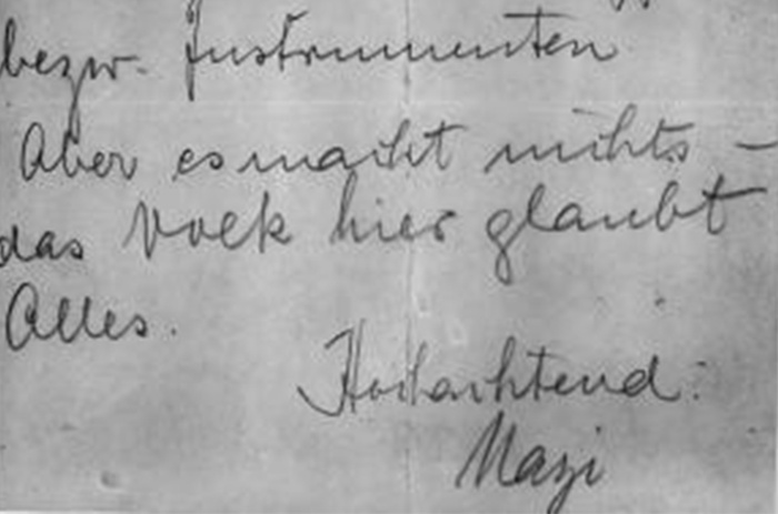 The message reads: “Enclosed cutting from the Edinburgh The News of the World. Typical for the English way of causing ill-feeling and at the same time characteristic of the perfect ignorance of journalists in this country regarding the difference between military weapons and military tools. But this does not make any difference – the people here believe everything. Yours truly, Nazi.”